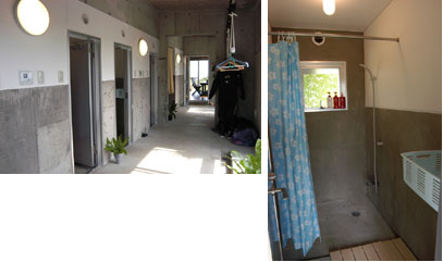 使用する器材が多く、なにかと手間のかかるのがダイビングの前後。そこでコンカラーはダイバーの動線を考慮して器材ルームを設計しました。器材洗い場と干し場を最短の距離に設置したことで、洗って水を含んで重くなった器材を持ち運ぶ面倒から解放されます。脱水機がありますので、濡れた水着など水切りできます。器材干し場は室外・室内の両方に設置。そして室内干し場の向かいにシャワールームが4室あります。洋服が濡れない動線です。